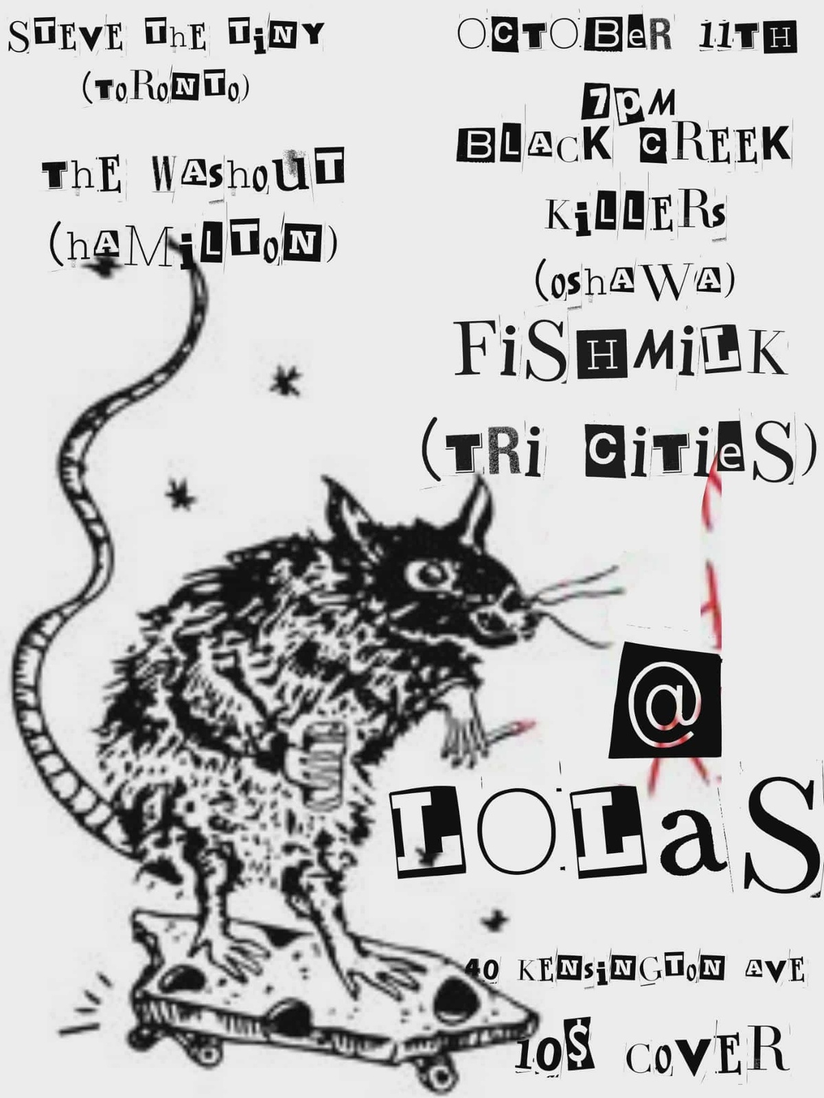 Next Sat Oct 11th at Lola in Toronto!! We're having a folk punk night full of wild musicians!! We're bringing out The Black Creek Killers (Outlaw Country) from Oshawa to play with Fishmilk (Outlaw Folk Punk) from Kitchener, throwing The Washout and Steve The Tiny in the mix to make it one hell of an October banger!! Come on out to 40 Kensington ave and have a crazy night with us!!