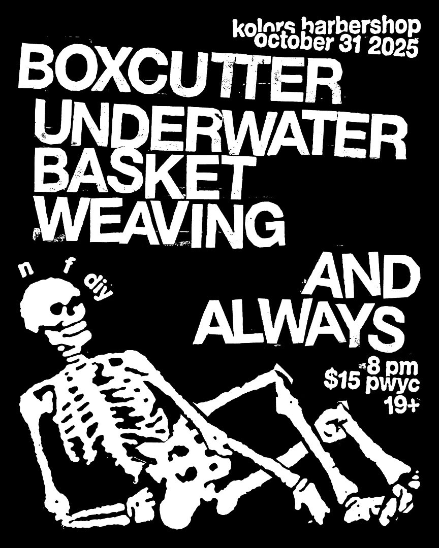 Halloween falls on a weekend for the first time in 5 years, and Ontario's finest are primed to celebrate in style! Emo prodigies UNDERWATER BASKET WEAVING make the trip out from Car City to show why they're the crown jewel of the Tri-Cities. Meanwhile, local girl group BOXCUTTER strike fear into the hearts of Toronto men as they prep for a weekend run to Montréal with AND ALWAYS, brought together by a love for heart-wrenching riffs & post-hardcore catharsis. 3 great bands playing screamo the way it was meant to be—hard, fast & ready to explode. COSTUMES STRONGLY ENCOURAGED!