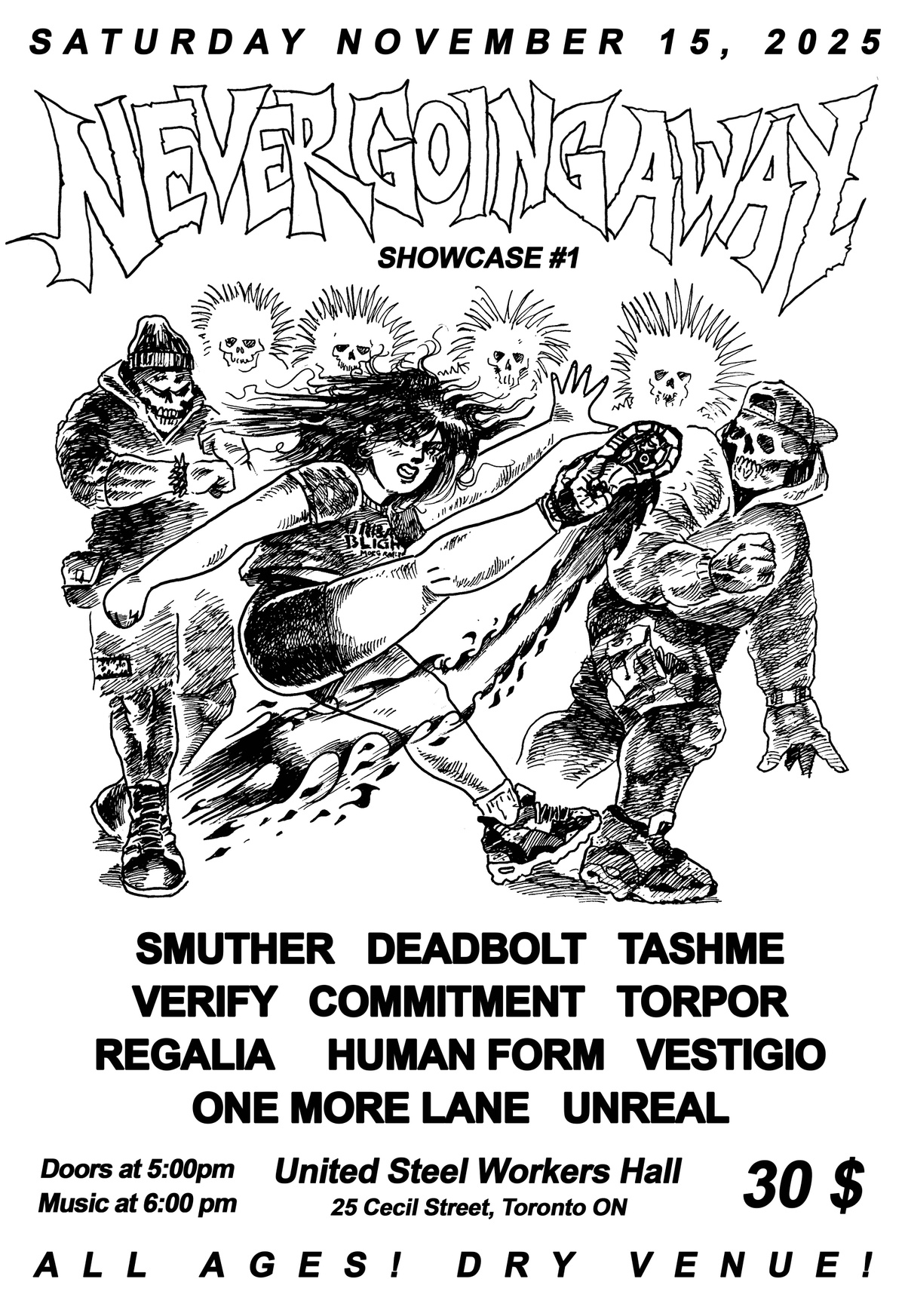 Come celebrate love, joy, and DIY at the United Steelworkers Hall on November 15, 2025, for the first edition of Never Going Away. We'll be showcasing some of the best DIY hardcore & punk bands that the underground has to offer, some from places far and wide, others from right here in Toronto. Here's this year's lineup:
