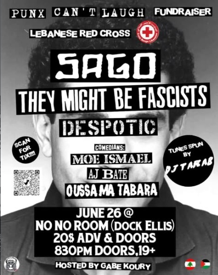 Fundraiser for Lebanon, on Friday, June 26 at @nonoroom_thedockellis @thedockellis. This show is hosted by the good folks from @punxcantlaugh2014 and @jerseyfresh05 alongside our comrades @sagoisaband, @theymightbefascists, @djtarab, and comedians @moemoeismail, @ajbate__ and @ousscomedy. The proceeds from this show will go towards @lebaneseredcross. Doors at 8:30 pm. $20 advance link in @punxcantlaugh2014 bio.